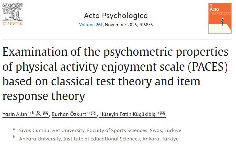 Fakültemiz öğretim üyeleri Prof. Dr. Hüseyin Fatih Küçükibiş, Dr. Öğr. Üyesi Burhan Özkurt ve Dr. Öğr. Üyesi Yasin Altın’ın ortak çalışması, uluslararası düzeyde önemli bir başarıya imza attı. “Examination of the psychometric properties of physical activity enjoyment scale (PACES) based on classical test theory and item response theory” başlıklı bilimsel makale, psikoloji alanında yüksek etki değerine sahip, SSCI indeksli ve Q1 diliminde yer alan Acta Psychologica dergisinde yayımlandı.